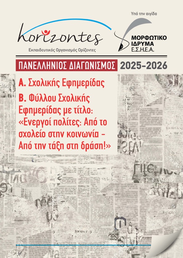 Ο Εκπαιδευτικός Οργανισμός «Ορίζοντες» υπό την αιγίδα του Μορφωτικού Ιδρύματος της Ε.Σ.Η.Ε.Α. προκηρύσσει για 8η σχολική χρονιά Πανελλήνιο Διαγωνισμό Σχολικής Εφημερίδας. Ο διαγωνισμός αφορά σχολικές μονάδες πρωτοβάθμιας (συγκεκριμένα της Ε΄ και ΣΤ΄ Δημοτικού) και δευτεροβάθμιας εκπαίδευσης, γενικής και ειδικής εκπαίδευσης του ελλαδικού χώρου, της Κύπρου και της ομογένειας. Ο διαγωνισμός περιλαμβάνει δύο κατηγορίες, προκειμένου να μπορούν να λαμβάνουν μέρος σχολεία που εκδίδουν φύλλο αφιερωμένο στην ιδιαίτερη θεματική που επιλέγεται κάθε χρόνο, αλλά και σχολεία που εκδίδουν εφημερίδες γενικού ενδιαφέροντος και ποικίλης ύλης.